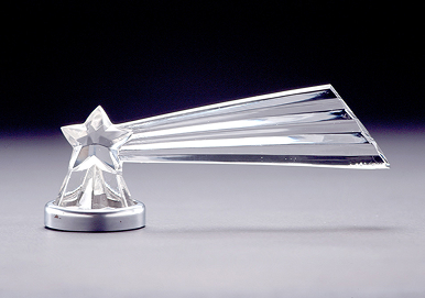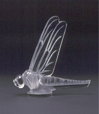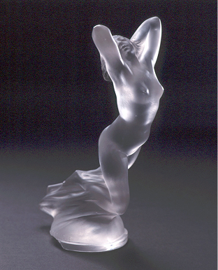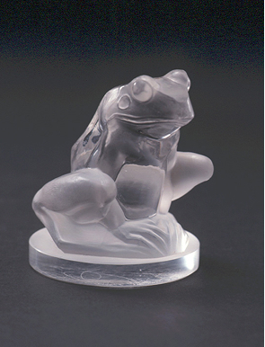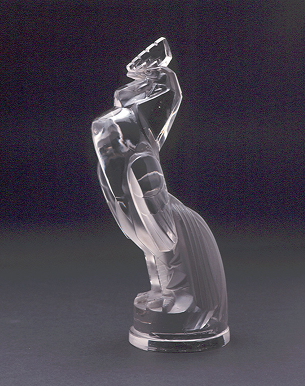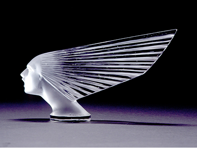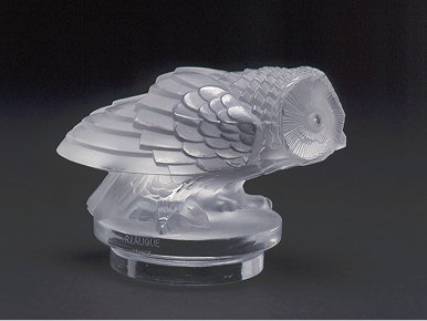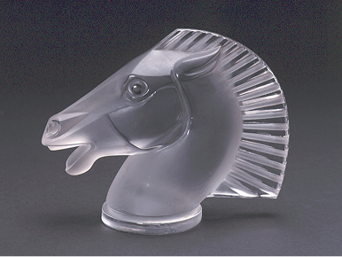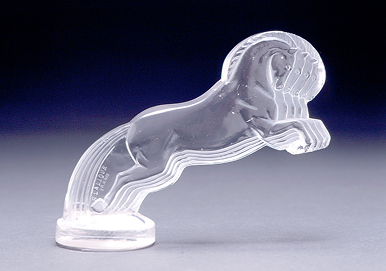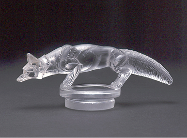 In the 1920s, many luxury cars featured mascots on their radiator caps. While most mascots were metal, the French glass designer René Lalique (1860−1945) used his advanced techniques to create glass versions. These mascots are not only fine works of art but were also designed to be illuminated from within by a miniature light bulb in the base; the color could be changed by inserting a tinted translucent disk.