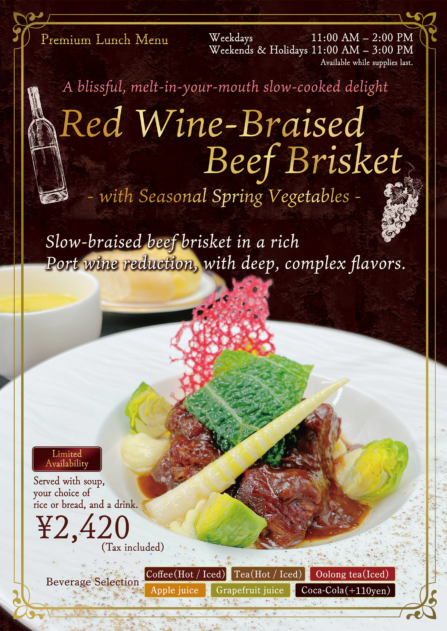 A luxurious stew made by slowly braising beef brisket in rich and aromatic port wine.