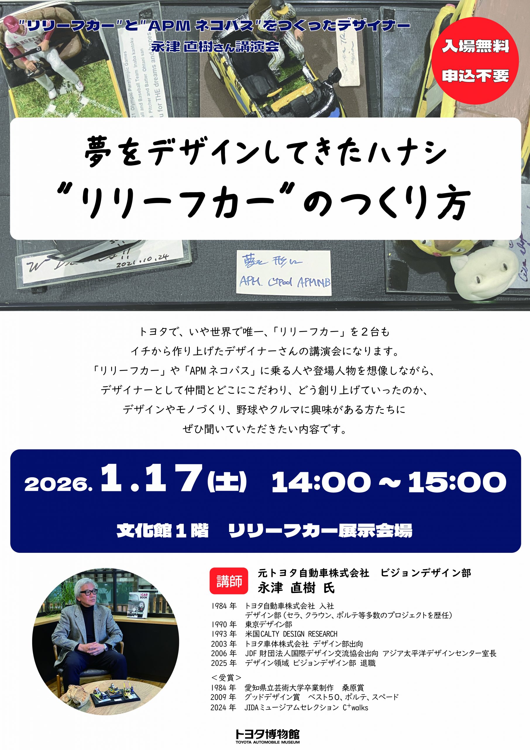 『夢をデザインしてきたハナシ “リリーフカー”のつくり方』と題し、今回展示する2台の「リリーフカー」をイチからつくり上げた、元トヨタ自動車㈱のデザイナー 永津直樹さんによる講演会を開催します。