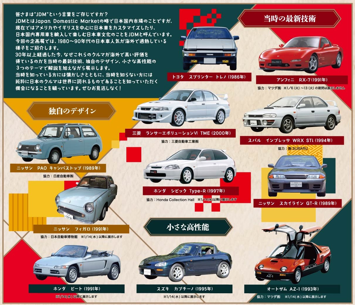 今回の企画展では、多くのファンを魅了し続けている1980〜90年代の日本車約10台を「当時の最新技術」「独自のデザイン」「小さな高性能」の3つのテーマに分けてご紹介します。