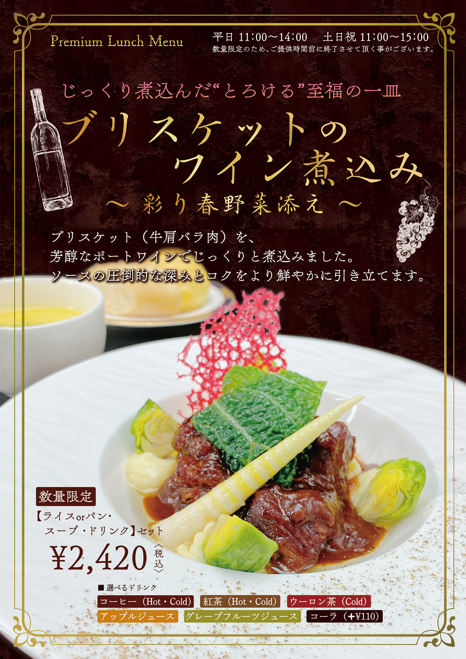 芳醇なポートワインで、ブリスケット(牛肩バラ肉)をじっくりと煮込んだ贅沢な一皿。
