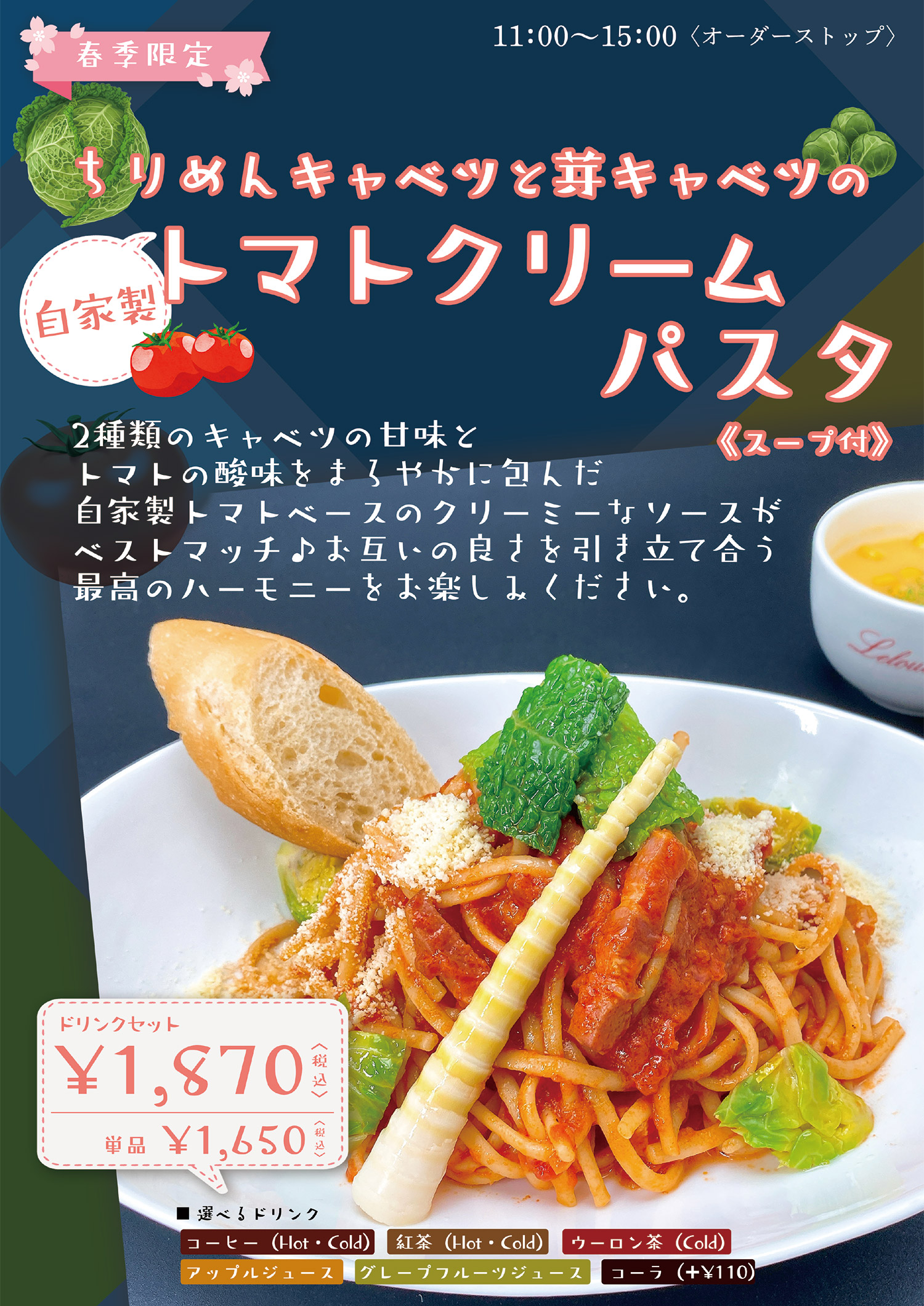 ちりめんキャベツと芽キャベツ、2種類のキャベツのやさしい甘みを、まろやかなトマトクリームソースで包み込んだ春色パスタ。
