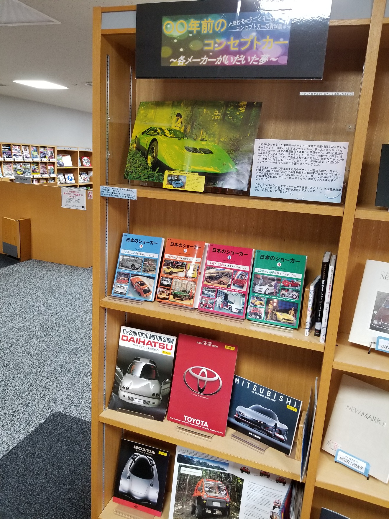 令和2年最初の図書室イベントコーナー棚展示は「○○年前のコンセプトカー」と題してコンセプトカーについての資料を集め展示しています。昨年の2019年東京モーターショーから歴代を振り返り、書籍や図書室所蔵の過去のショーパンフレットなど、関連資料を集めました。1995年のトヨタのショーパンフレットには、文化館1階の展示車両トヨタ・モーグルも掲載されています!歴代のコンセプトカー、各メーカーのいだいた夢をのぞいてみませんか?