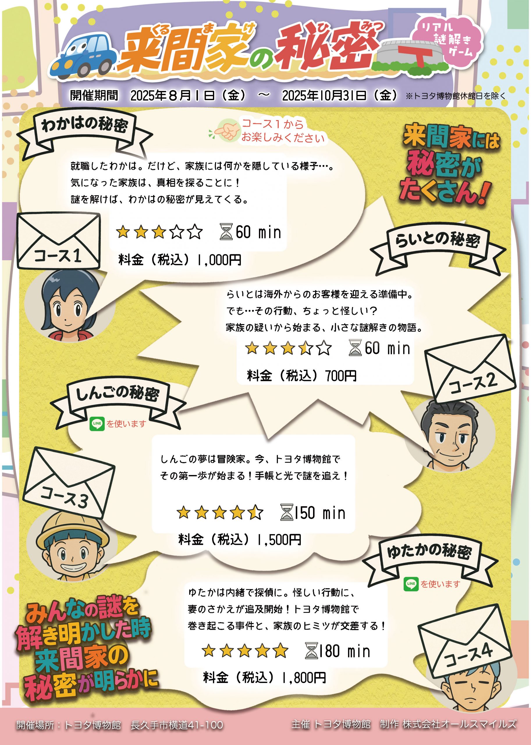 クルマが好きな来間さん一家が帰ってきました!クルマと謎解きが好きな、来間さん一家が巻き起こす謎解きイベント第2弾です。今回は家族が抱えている秘密を解き明かしていきます。コースは全部で4コース、それぞれのストーリーを展開していきます。