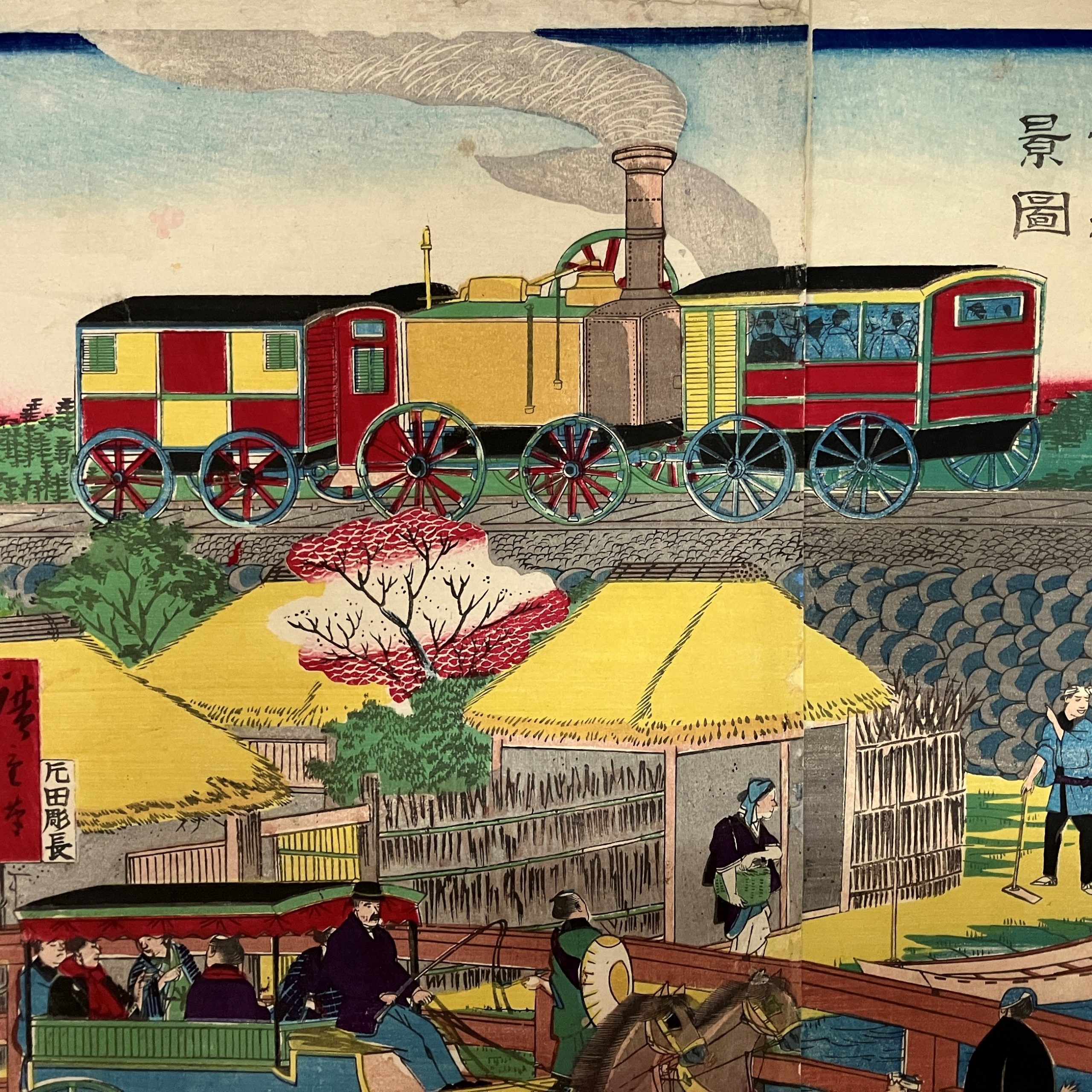 2025年9月2日(火)より、クルマ文化資料室の錦絵の展示替えを行い、「不思議な鉄道」をテーマにした作品を紹介しています。1872年(明治5)10月14日、新橋~横浜間に日本で初めての鉄道が開通しましたが、その頃の錦絵には、実際の様子とは違う鉄道が多く描かれています。クルマ文化資料室でぜひお楽しみください。