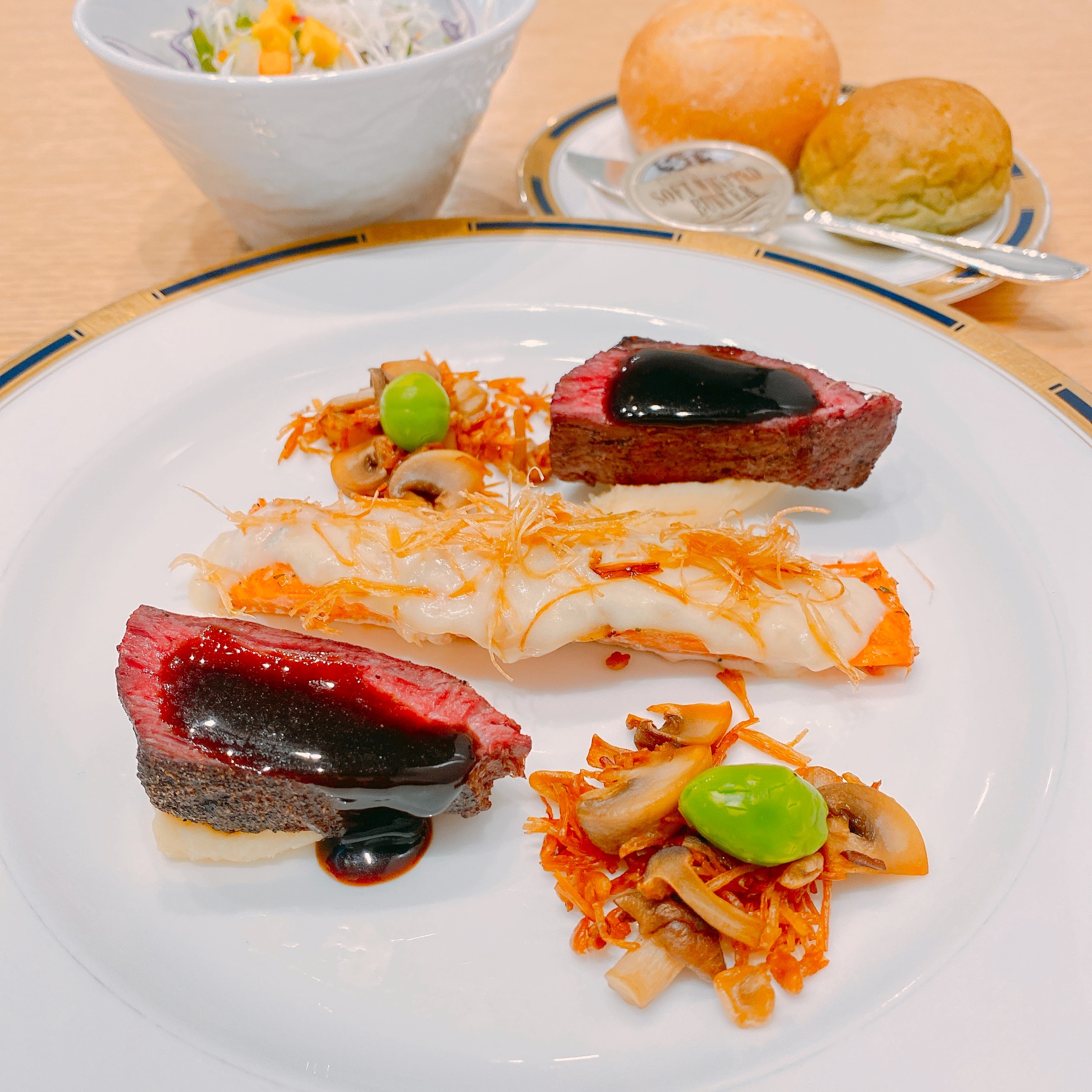 | 牛肉のロースト さつま芋ピュレとバルサミコソース | ローストした牛肉に、まろやかな甘みのさつま芋ピュレを合わせました。 芳醇なバルサミコソースが牛肉の旨味とピュレにマッチします。 |